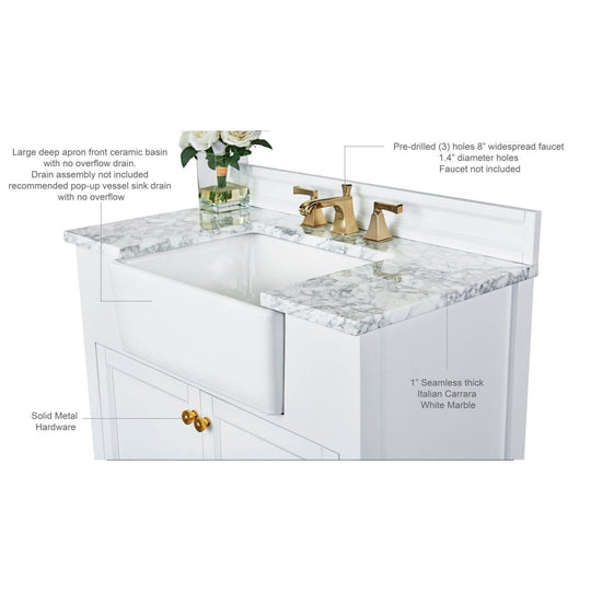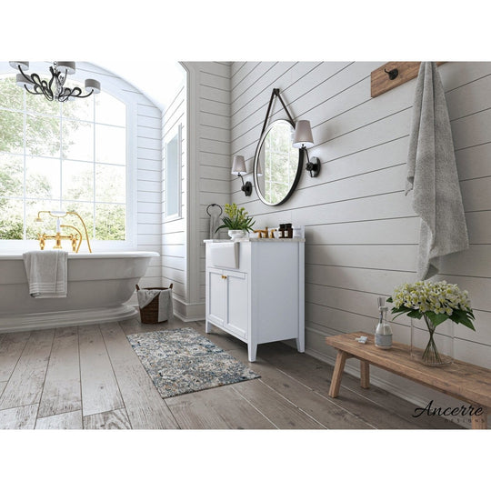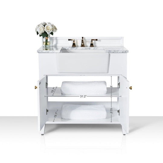 Ancerre Adeline Bathroom Vanity with Farmhouse Sink and Carrara White Marble Top Cabinet Set - VTS-ADELINE-36-W-CW-GD