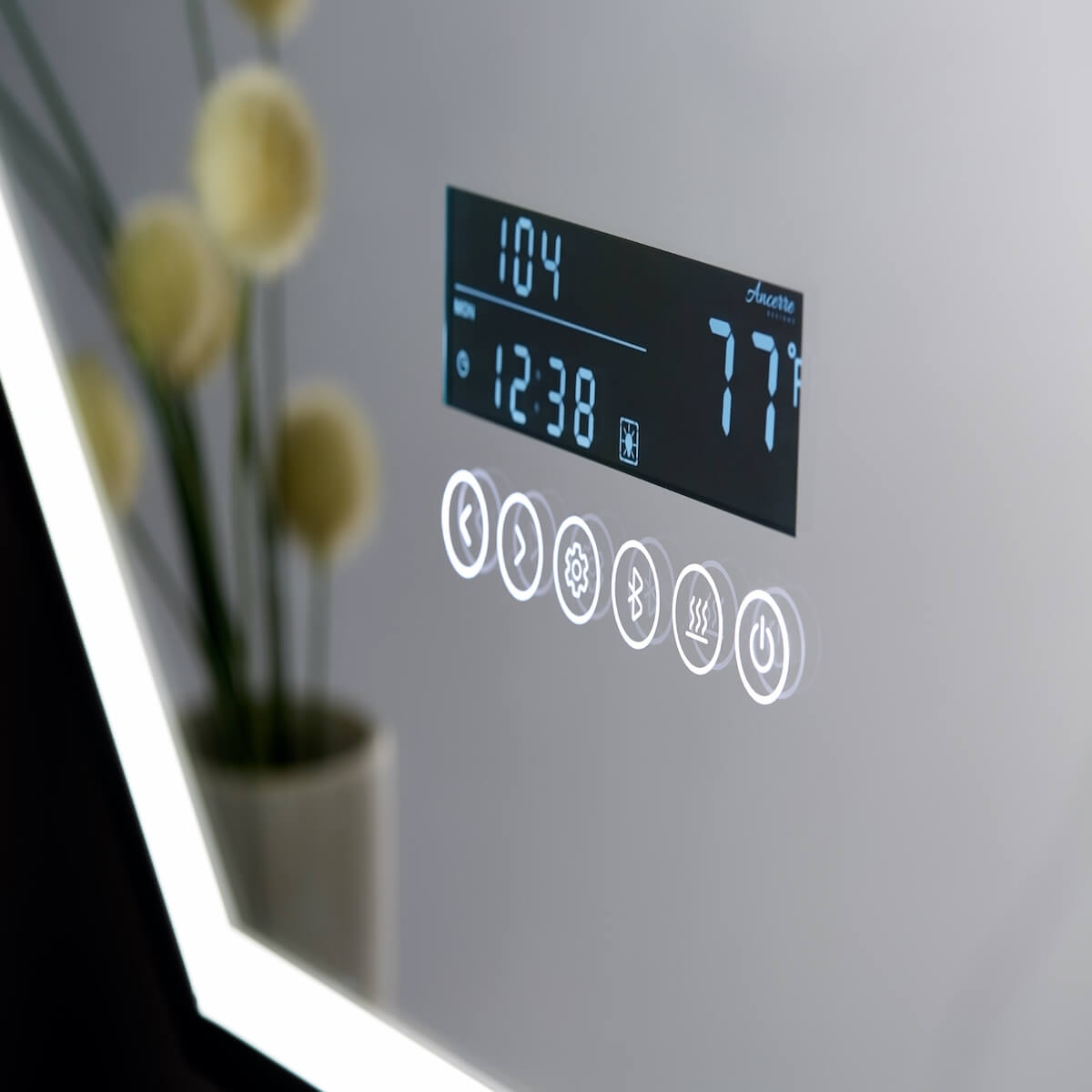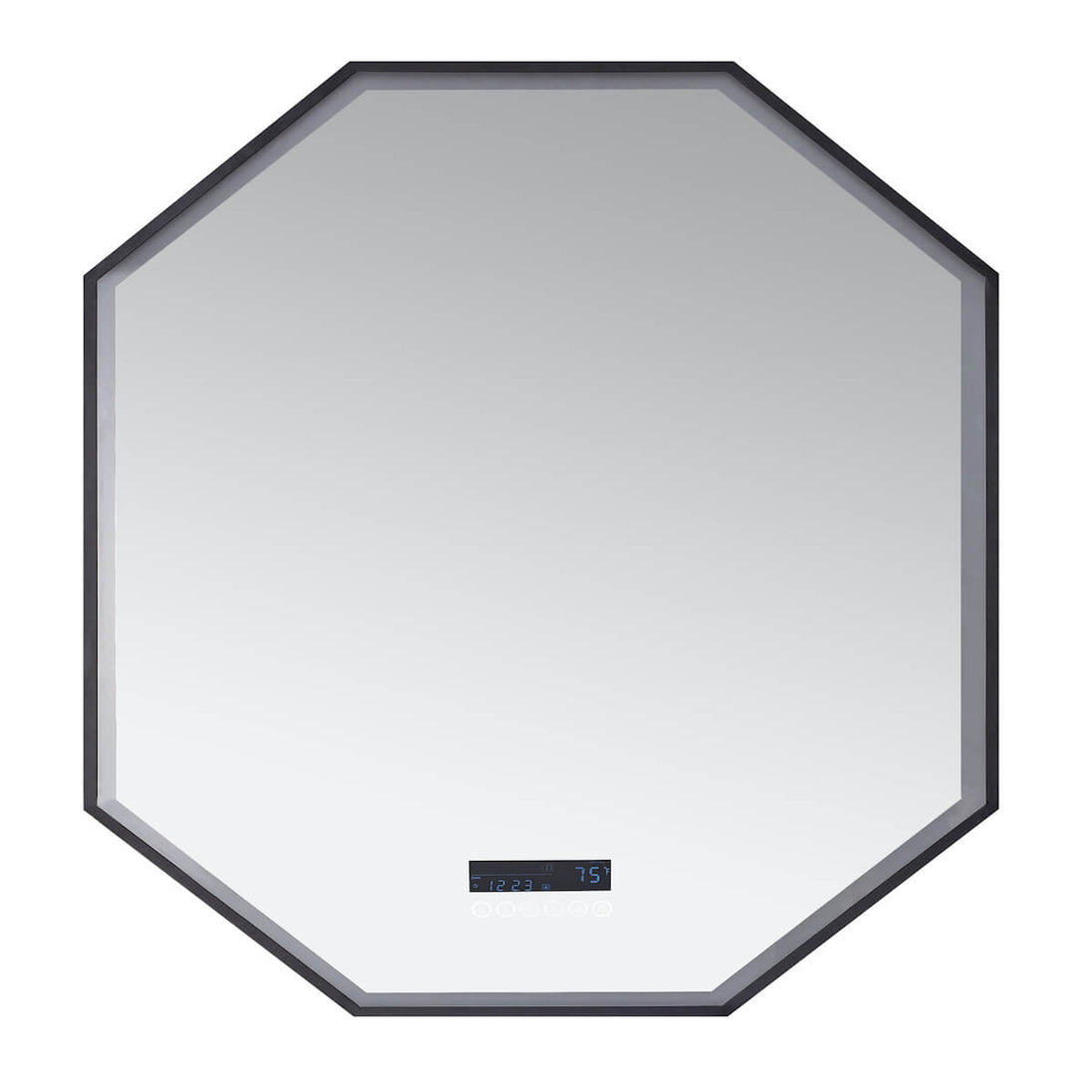 Elevate your bathroom with the Otto 24” LED Mirror by Ancerre Designs, a modern octagon-shaped mirror that seamlessly blends cutting-edge technology with sophisticated craftsmanship. Handcrafted by skilled artisans, this mirror features Bluetooth speakers, a built-in defogger, and a digital display that provides time, temperature, day, date, and month—making it both stylish and functional.
