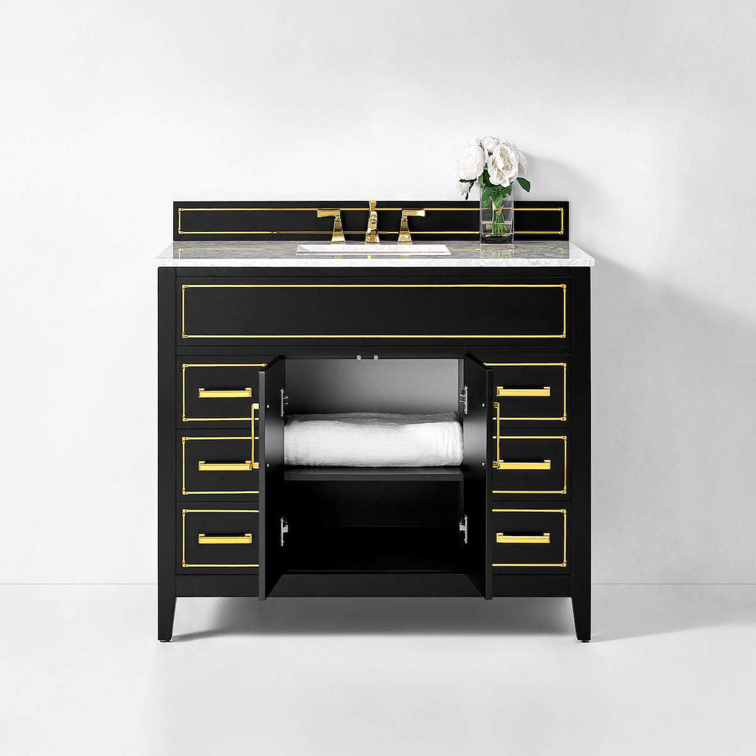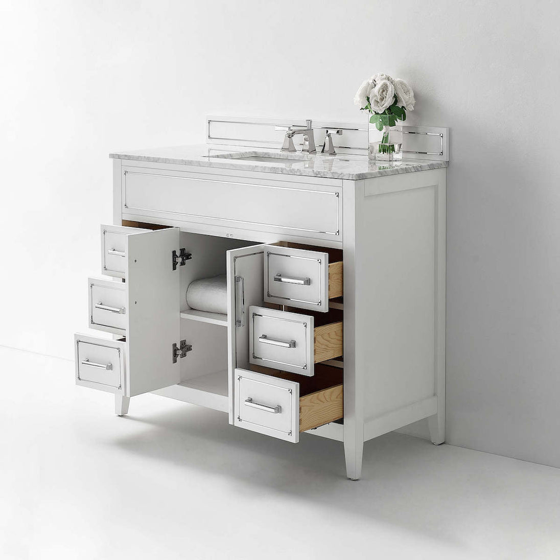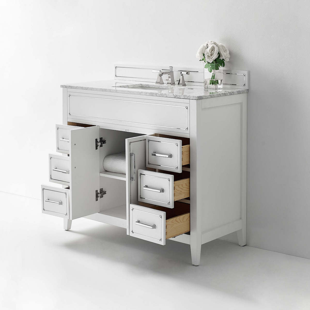 Elevate your bathroom with the Aspen Single Vanity by Ancerre Designs, a statement piece that exudes timeless luxury and master craftsmanship. Designed with premium solid hardwood construction and fine Italian Carrara marble, this vanity seamlessly blends classic elegance with modern functionality.