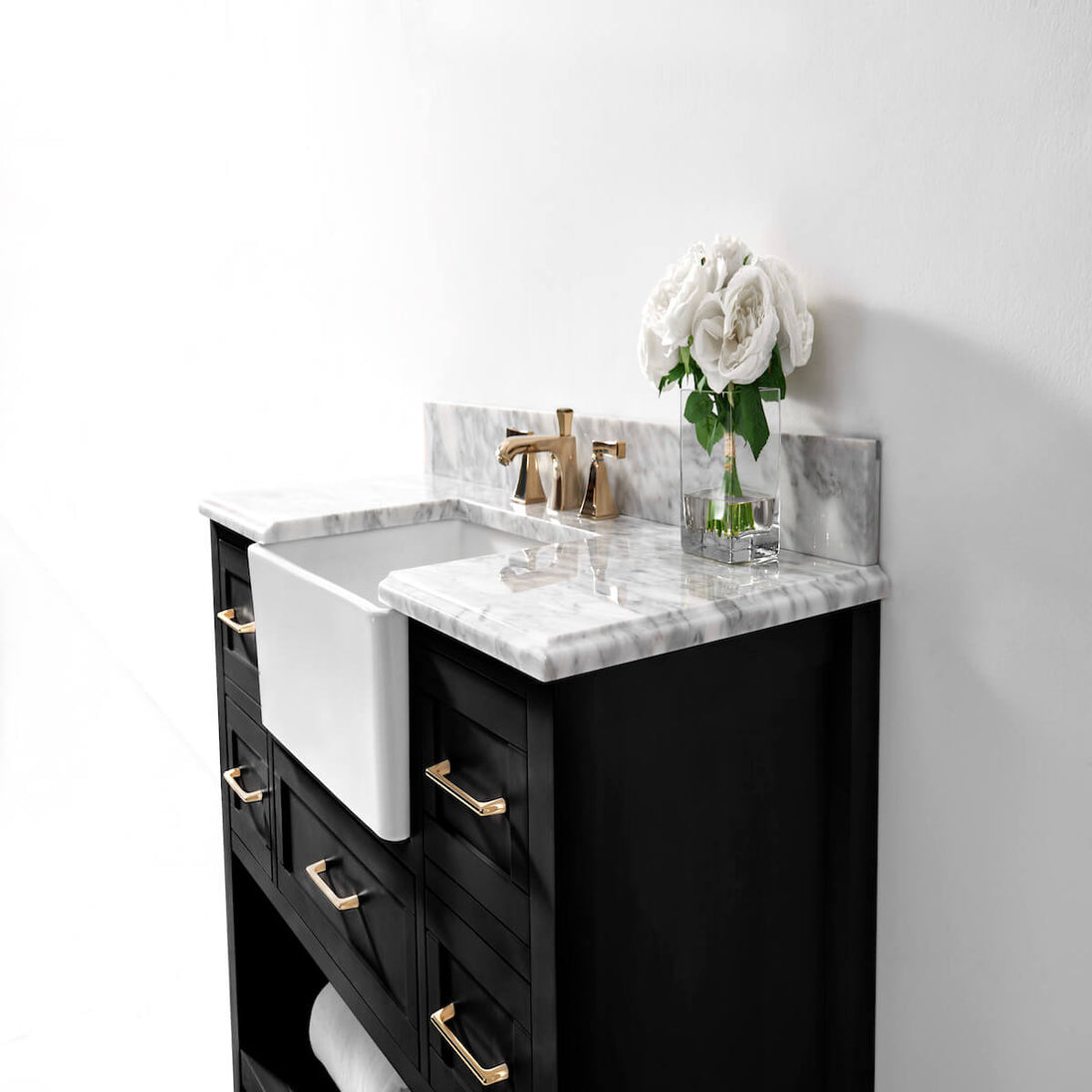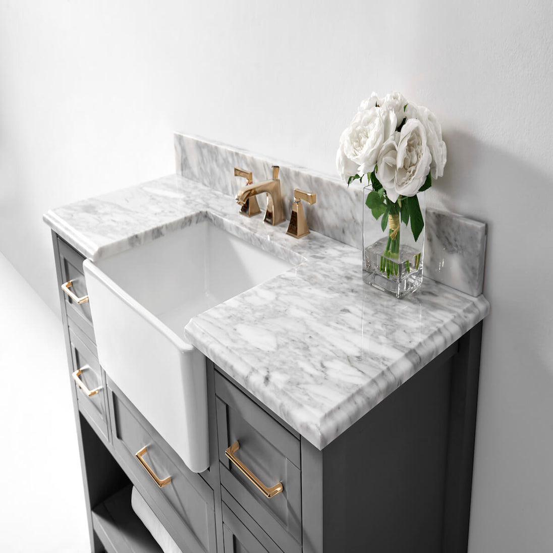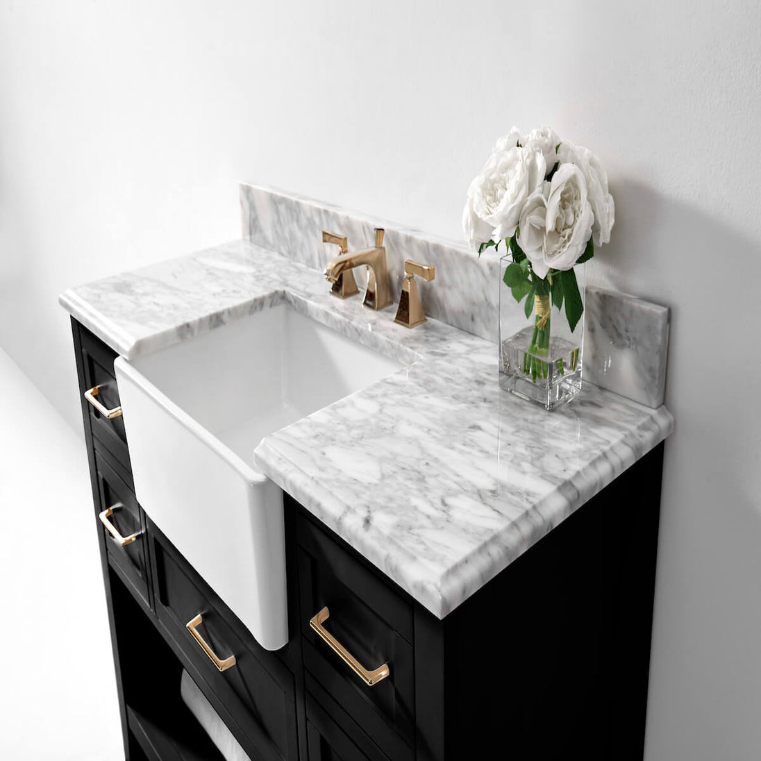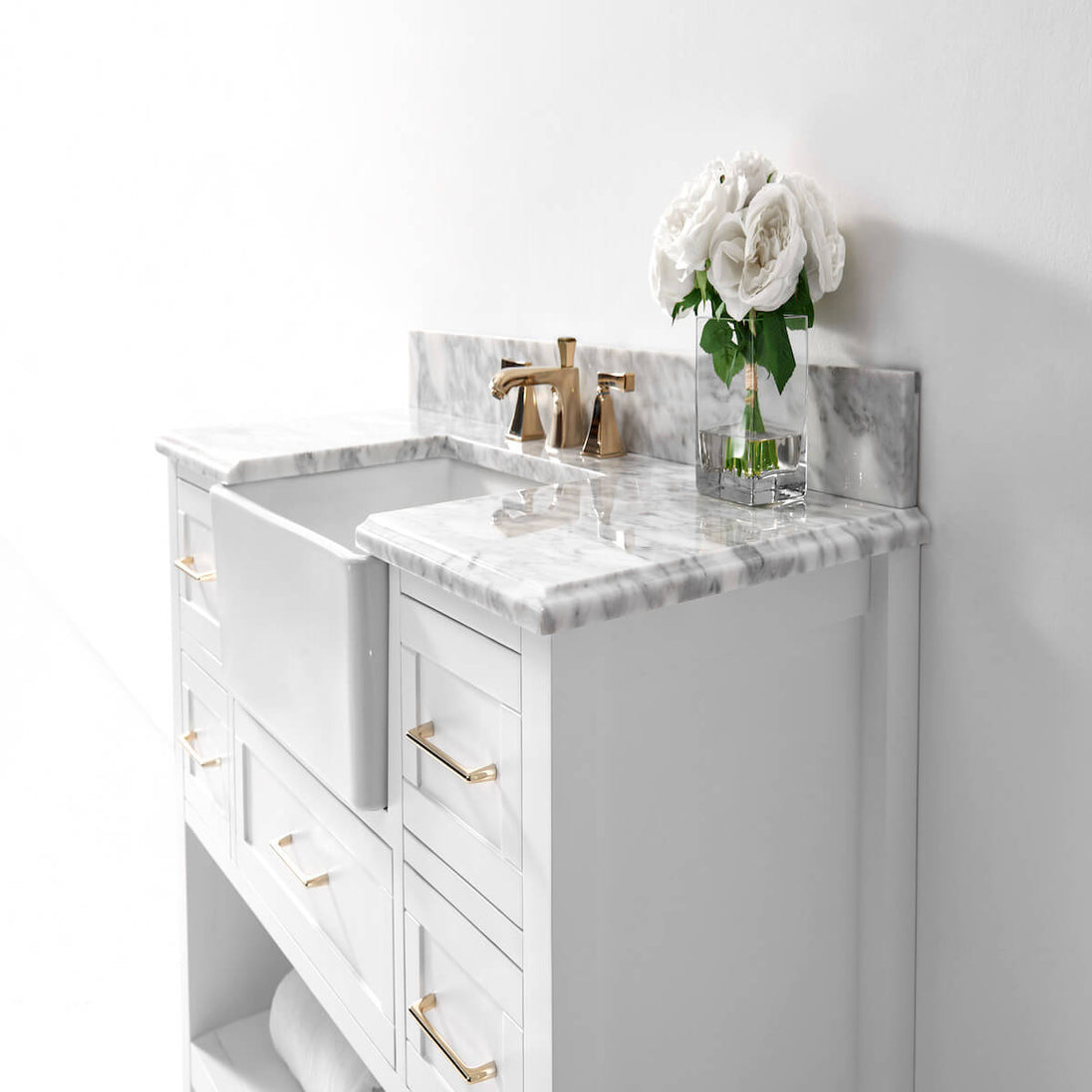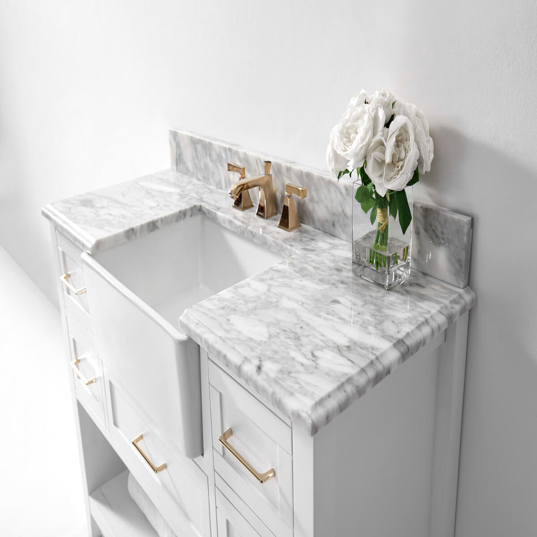✔ 4” Carrara White Marble Backsplash – Enhances aesthetic (not glued to the top for easy cleaning)
