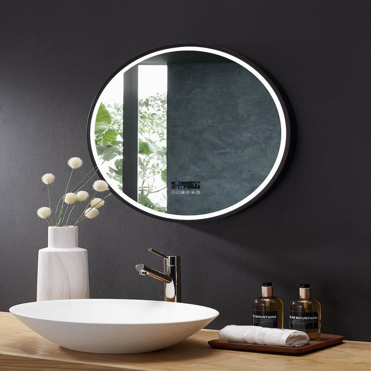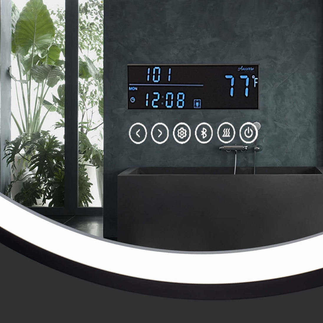 Upgrade your bathroom with the Cirque 30” LED Mirror by Ancerre Designs, a handcrafted modern mirror designed for both functionality and style. Featuring a sleek matte black aluminum frame, this premium LED mirror includes Bluetooth speakers, a built-in defogger, and a digital display that conveniently shows time, temperature, day, date, and month.