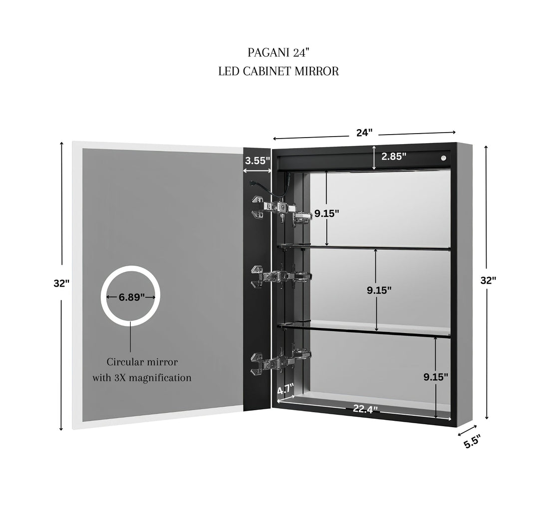 Designed for wall mounting or recess mounting, this cabinet is crafted with a sleek anodized aluminum body frame and comes in multiple sizes to fit any bathroom. Let the Pagani LED Mirror Cabinet transform your bathroom into a stylish and functional sanctuary.