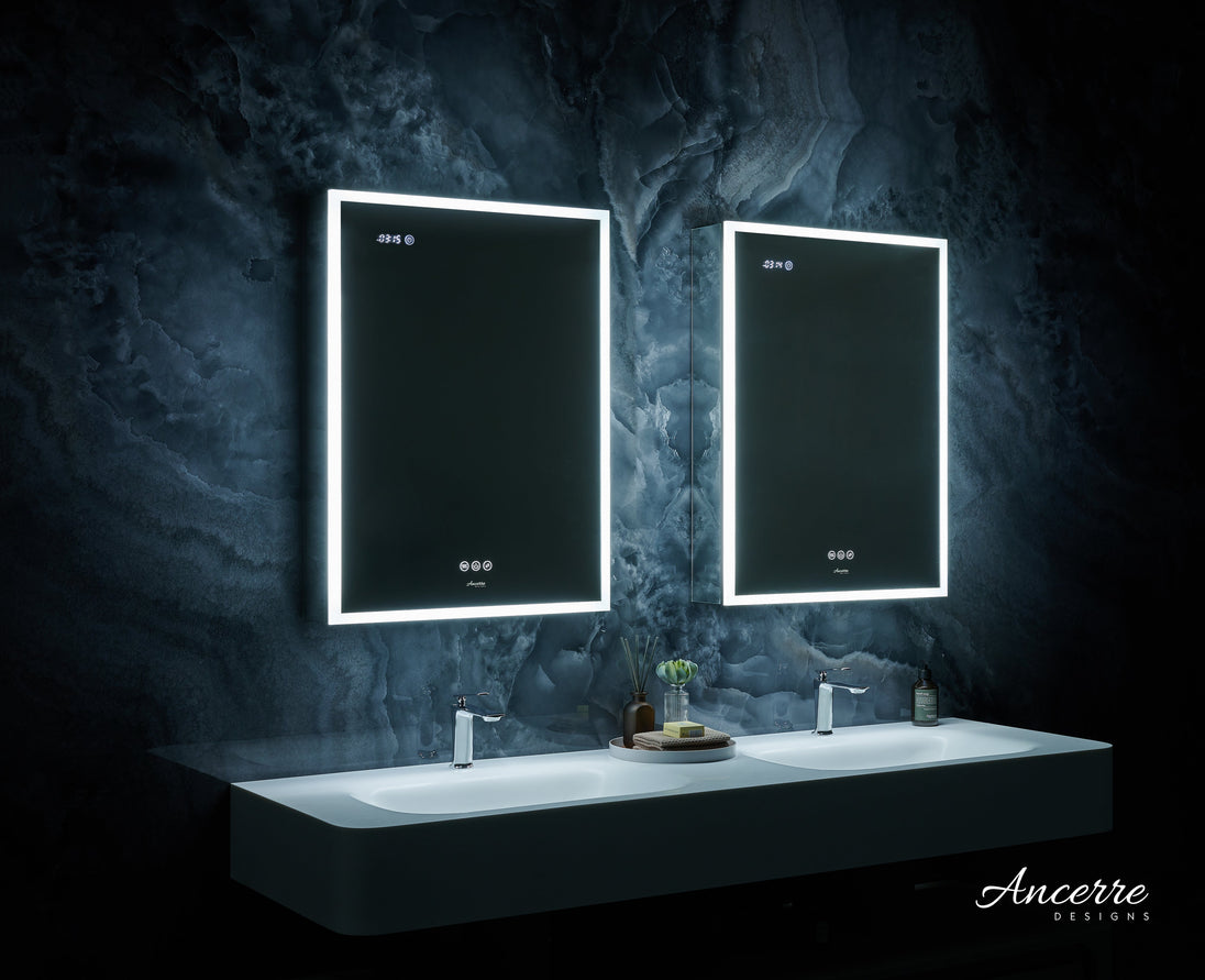 Elevate your bathroom with the Ancerre Designs Pagani LED Mirror Cabinet, a seamless blend of elegance and cutting-edge functionality. This high-tech medicine cabinet not only offers a refined mirrored surface, but also includes a digital clock, defogger, and dimmable LED lights, ensuring your bathroom stays bright and stylish.