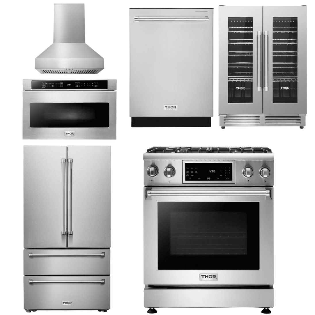 This premium Thor Kitchen appliance package is complete with a Professional 30" Natural Gas Range, 30" Range Hood, 36" Counter Depth Refrigerator, 24" Dishwasher, 24" Wine Coolers, and 24" Microwave Drawer.
