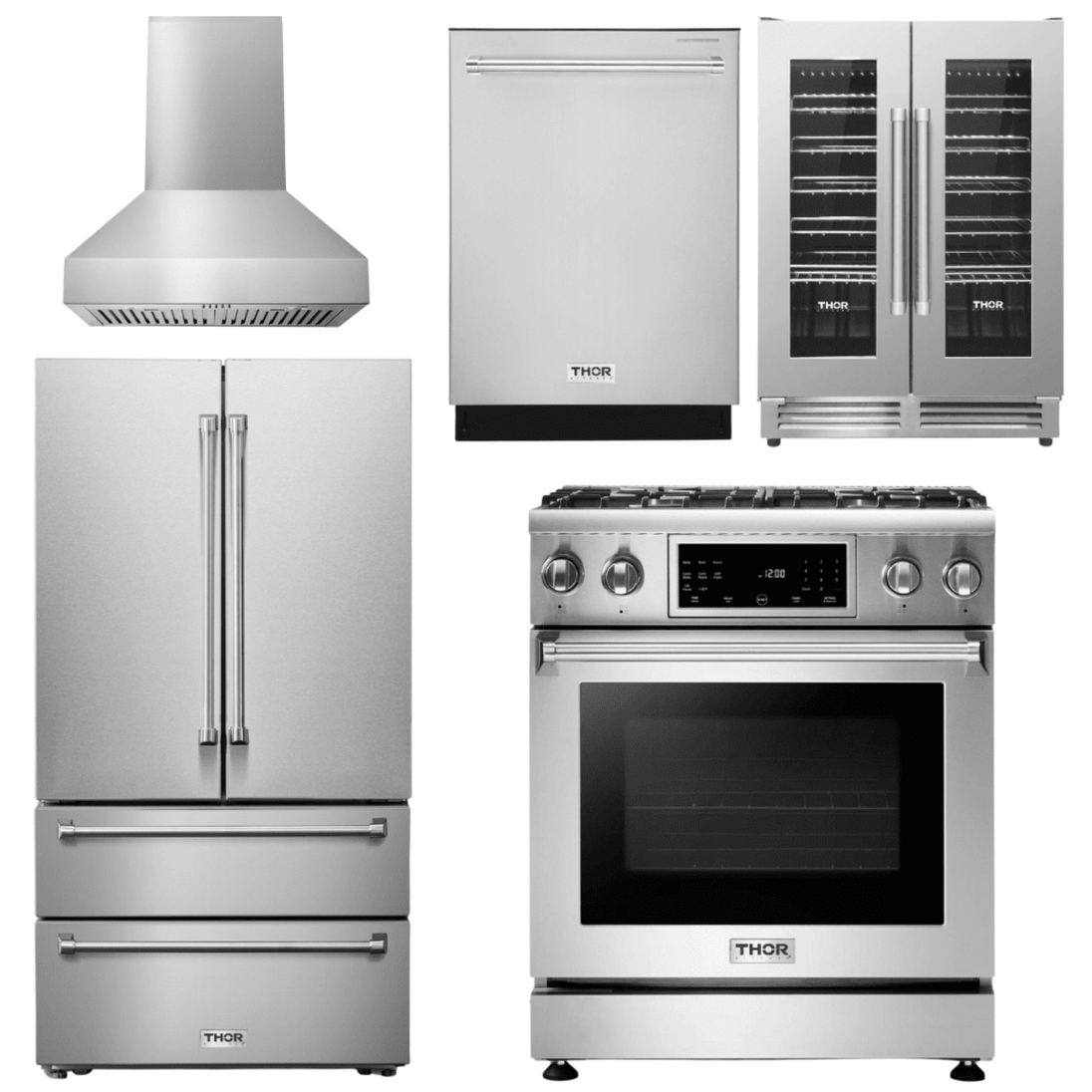 Thor Kitchen Appliance Package - 30 In. Gas Range, Range Hood, Refrigerator, Dishwasher, Wine Cooler, AP-TRG3001-W-3