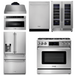 This Thor Kitchen appliance package is complete with a Self-Clean 36" Gas Range, 36" Under Cabinet Range Hood, Refrigerator with Water and Ice Dispenser, Dishwasher, Wine Cooler and a Microwave Drawer.