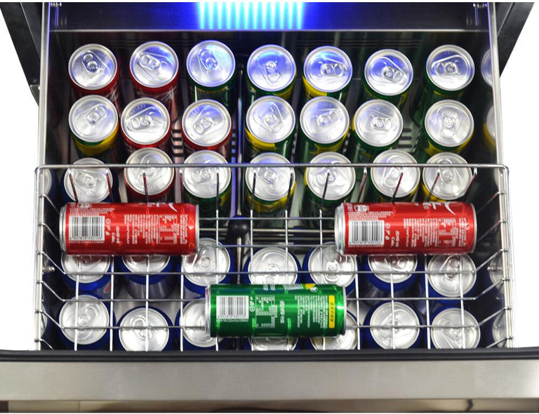 The Azienda Triple Zone Wine Cooler from Forno stores up to 108 bottles of wine with 16.25 cu. ft. of capacity. The wine cooler also features two refrigerated drawers, 9 sliding metal shelves and blue LED lights.