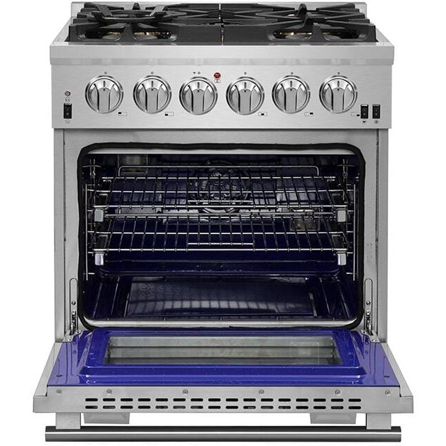This 30" Pro-Style Gas Range by Forno offers a 5 Defendi Italian Brass Burner cooktop and a 4.23 cu. ft. oven. The range also features cast iron grates, convection fan and halogen lighting.