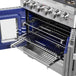 - Illuminated Oven Interior. The speckled blue enamel oven interior is illuminated by 2 halogen lights, providing visibility and adding a touch of elegance