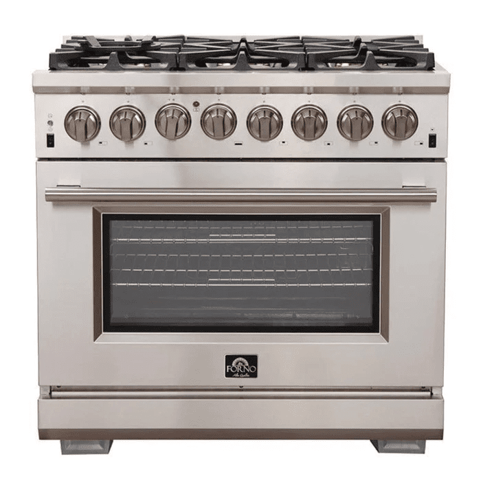 This 36" Pro-Style Dual Fuel Range by Forno offers a 6 Defendi Italian Brass Burner cooktop and a 5.36 cu. ft. oven. The range also features cast iron grates, convection fan and halogen lighting.