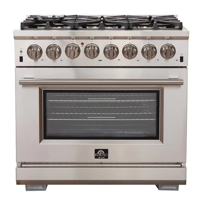 This 36" Pro-Style Dual Fuel Range by Forno offers a 6 Defendi Italian Brass Burner cooktop and a 5.36 cu. ft. oven. The range also features cast iron grates, convection fan and halogen lighting.