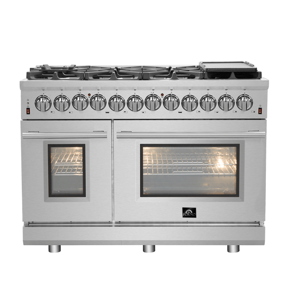 - Quality Assurance. Housed in a high-grade stainless steel body and zinc-coated metal knobs with bezels, the Forno 48-inch Gas Range is designed to withstand the test of time. We back our product with a solid 2-year warranty, ensuring your satisfaction