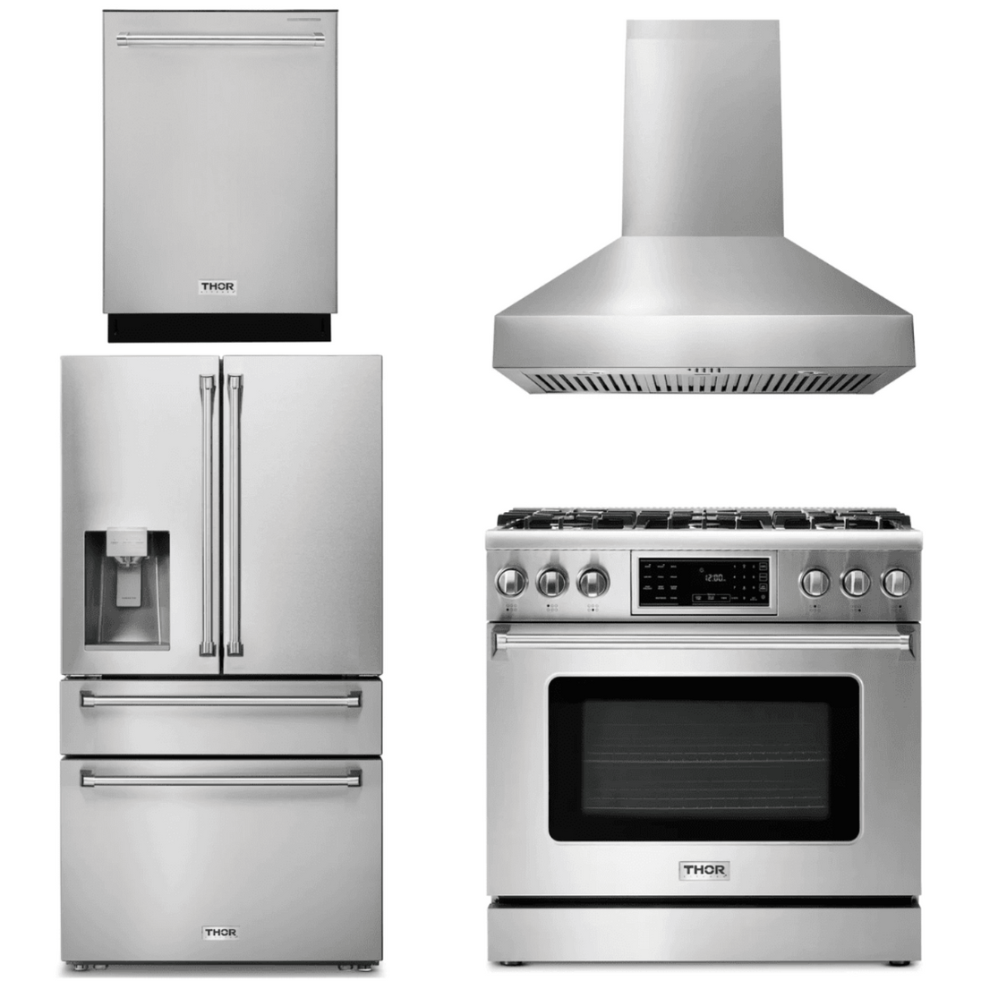 This premium Thor Kitchen appliance package is complete with a Professional 36" Natural Gas Range, 36" Wall Mount Range Hood, 24" Dishwasher and 36" French Door Refrigerator with Water and Ice Maker In-Door.