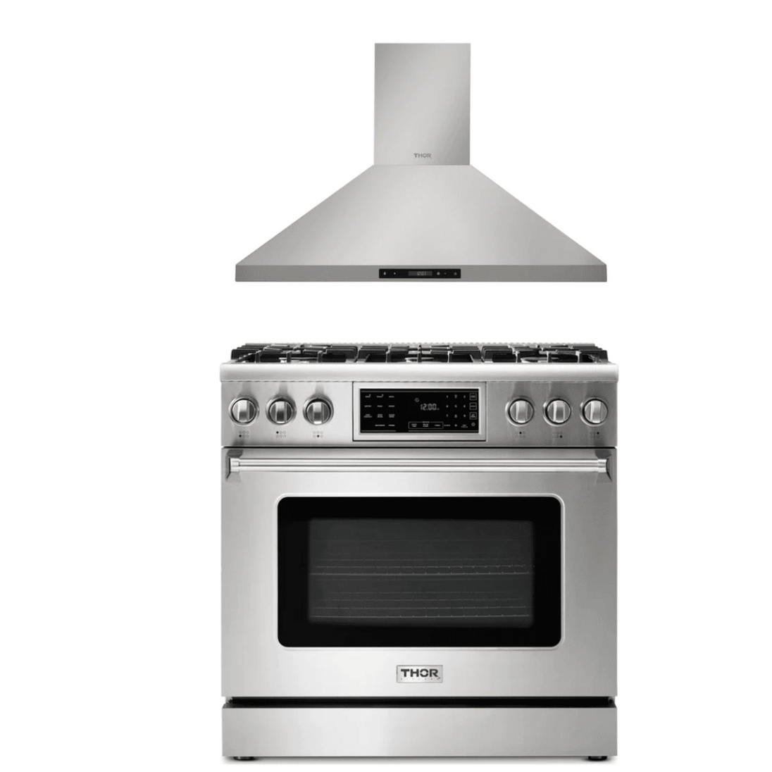 This premium Thor Kitchen Appliance Package includes a Professional 36" Natural Gas Range and 36" Wall Mount Range Hood. Cook like a professional with this complimentary kitchen appliance set!