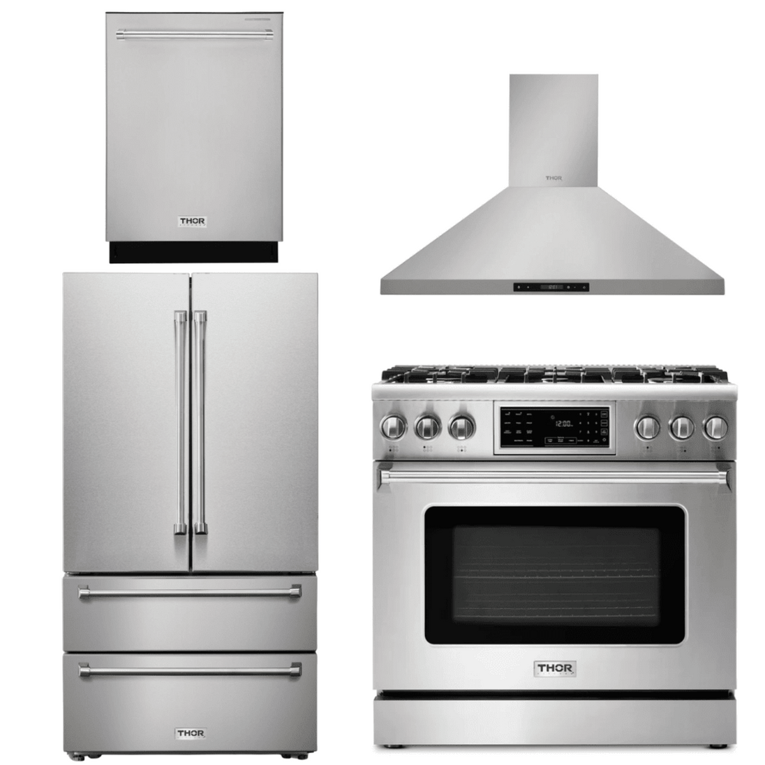 This premium Thor Kitchen appliance package is complete with a Professional 36" Gas Range, 36" Wall Mount Range Hood, 24" Dishwasher and 36" Counter Depth  Refrigerator.