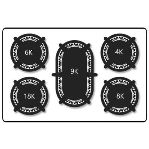 Front Right (Single) 8,000 BTU Front Left (Single) 18,000 BTU Middle (Single) 9,000 BTU Rear Right (Single) 4,000 BTU Rear Left (Single) 6,000 BTU Standard broil burner 10,500 BTU U-shape burner 18,500 BTU |