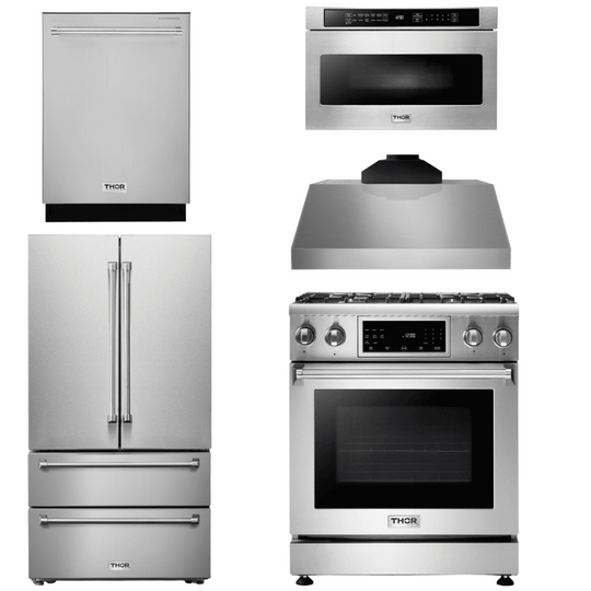 Thor Kitchen Appliance Package - 30 In. Gas Range, Range Hood, Microwave Drawer, Refrigerator, Dishwasher, AP-TRG3001-C-5