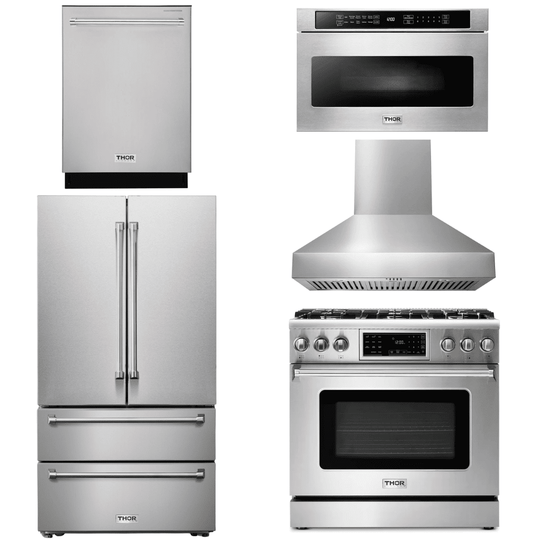 Thor Kitchen Appliance Package - 36 In. Gas Range, Range Hood, Microwave Drawer, Refrigerator, Dishwasher, AP-TRG3601-C-5