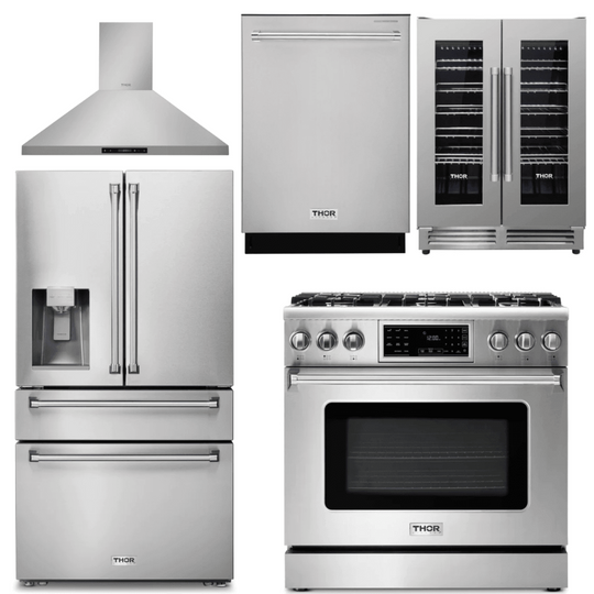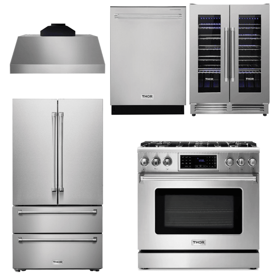 Thor Kitchen Appliance Package - 36 In. Gas Range, Range Hood, Refrigerator, Dishwasher, Wine Cooler, AP-TRG3601-C-3