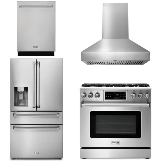 Thor Kitchen Appliance Package - 36 In. Gas Range, Range Hood, Refrigerator with Water and Ice Dispenser, Dishwasher,AP-TRG3601-C-7