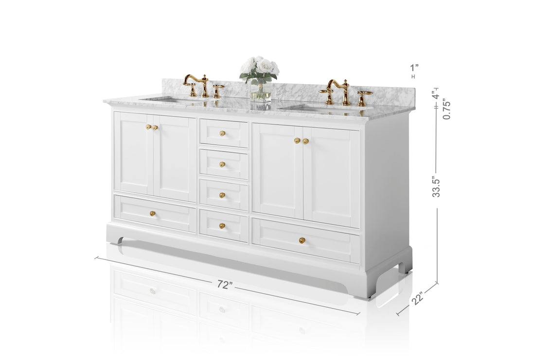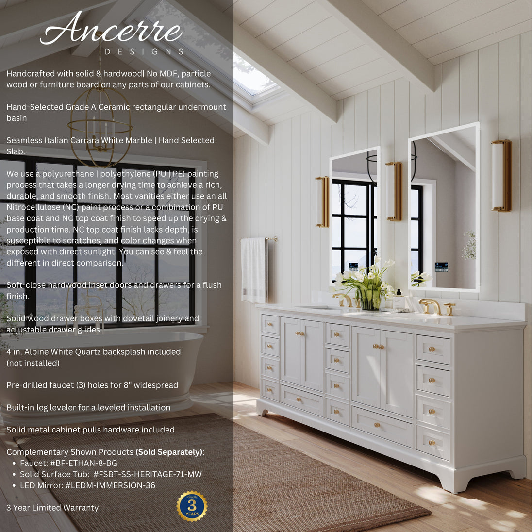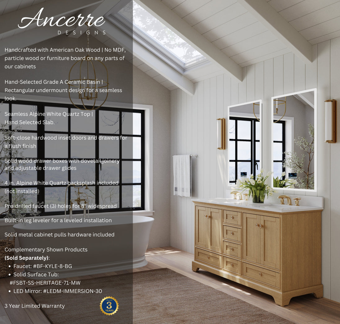 The Ancerre Audrey Collection is a masterfully handcrafted vanity set that embodies classic French elegance with modern functionality. Built from solid birch or American oak, this furniture-style vanity is meticulously designed for durability and sophistication. Each piece is topped with imported Italian Carrara White Marble or White Quartz, providing a luxurious finish. Featuring soft-close doors and drawers, dovetail wood construction, and premium brushed nickel hardware, the Audrey Vanity is the perfect centerpiece for any bathroom.