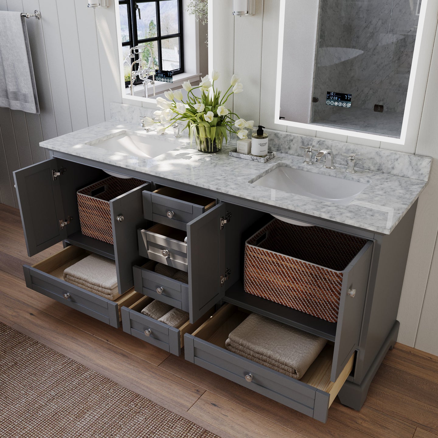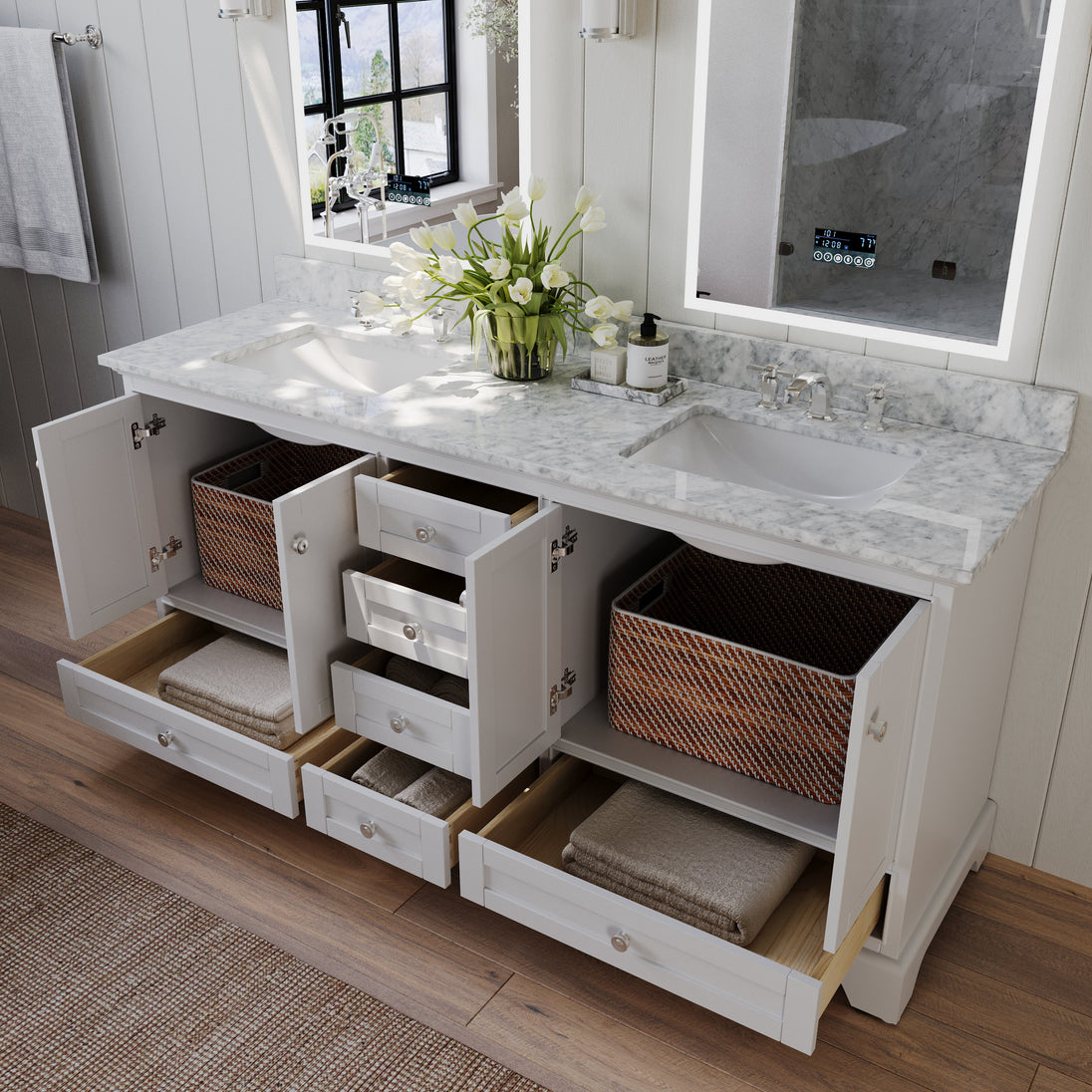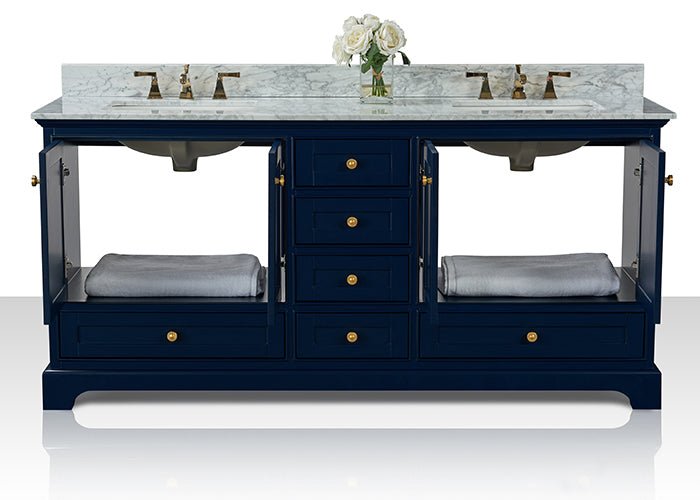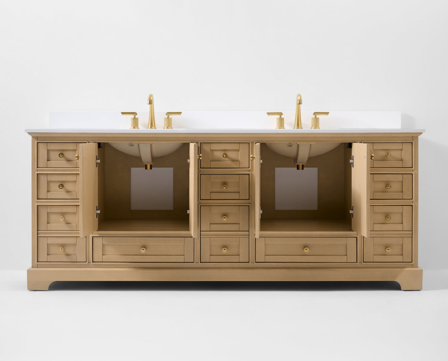 The Ancerre Audrey Collection is a masterfully handcrafted vanity set that embodies classic French elegance with modern functionality. Built from solid birch or American oak, this furniture-style vanity is meticulously designed for durability and sophistication. Each piece is topped with imported Italian Carrara White Marble or White Quartz, providing a luxurious finish. Featuring soft-close doors and drawers, dovetail wood construction, and premium brushed nickel hardware, the Audrey Vanity is the perfect centerpiece for any bathroom.