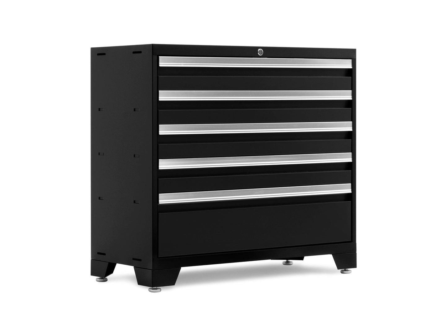 Elevate your workshop with the NewAge Products Bold Series 36 in. Tool Cabinet. The extra-large interior gives you a massive amount of organized drawer space for storing hand tools, hardware, power tools, and anything else you need to get the job done. With 5 fully-lockable full extension drawers with premium drawer liners, this cabinet was designed to securely store more of your items than ever before. The welded steel cabinet supports up to 600 lbs. of weight with a durable powder-coat paint finish that helps protect against spills and rust. Available in multiple color options, the 36 in. Tool Cabinet can be used as a standalone unit, or combined with wall cabinets and lockers to build a customized garage storage solution. Get the tool storage system that works for you with the Bold Series 36 in. Tool Cabinet.