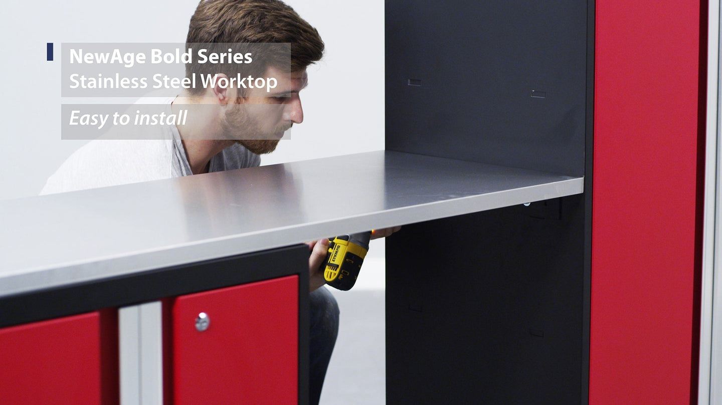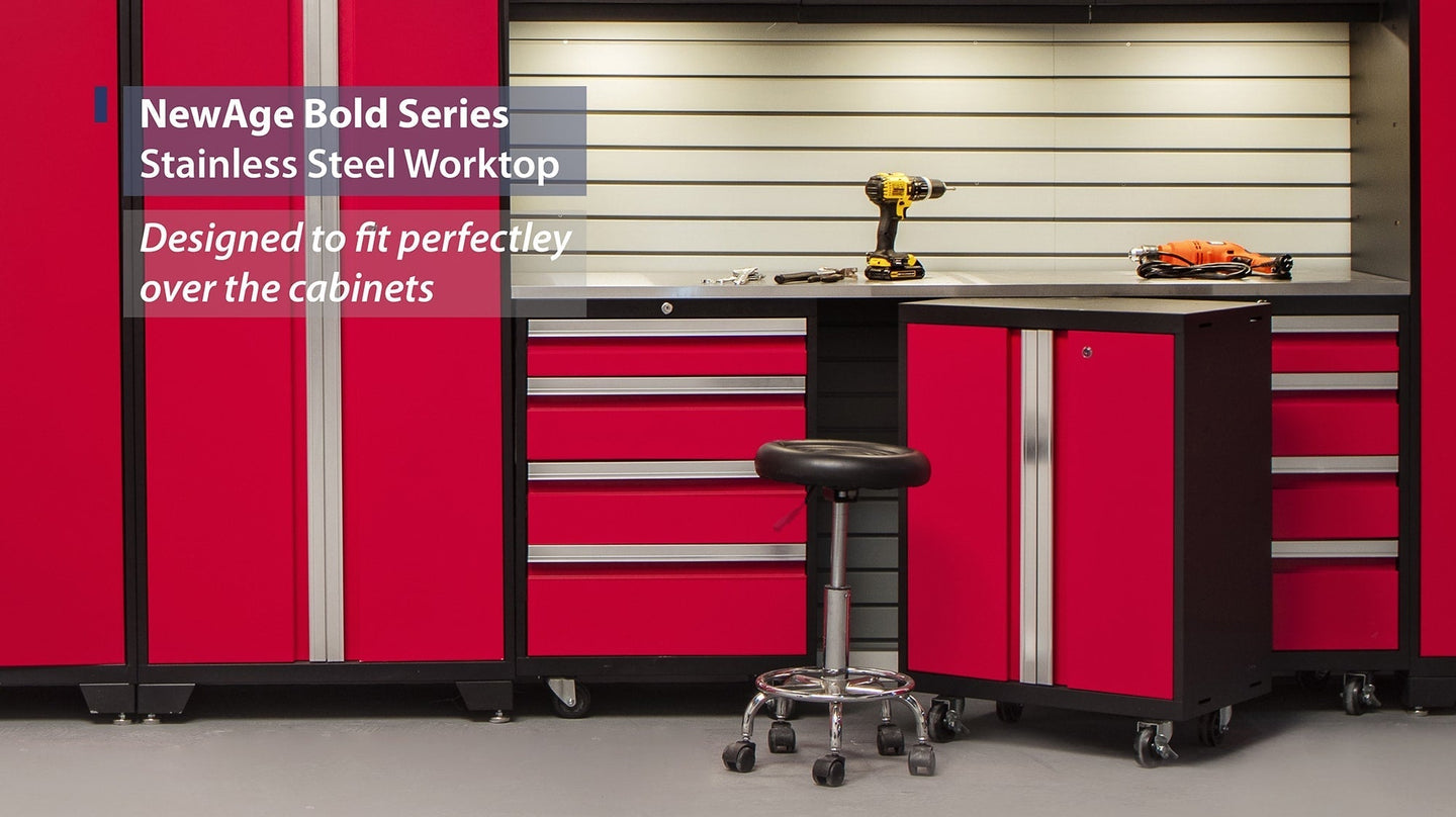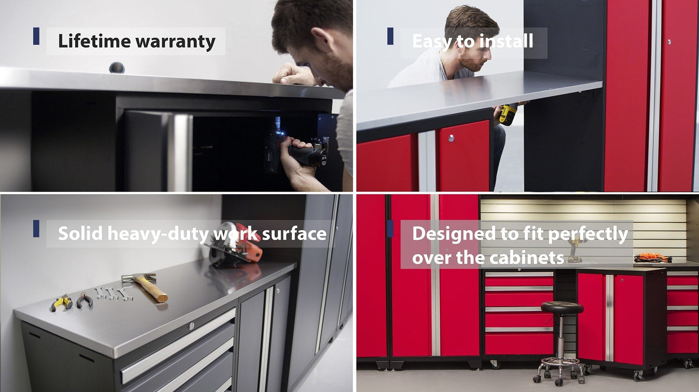 Top off your cabinet set, and add a rugged workspace to your garage with the Bold Series Worktop. Designed to fit over NewAge Products Bold Series base cabinets, this 1 inch thick Worktop provides you with a versatile space for DIY projects, kid’s crafts and more. The Worktop has a solid core and a stain-resistant finish that can stand up to the most demanding garage tasks.