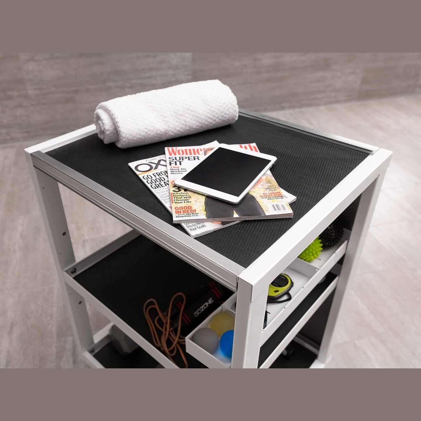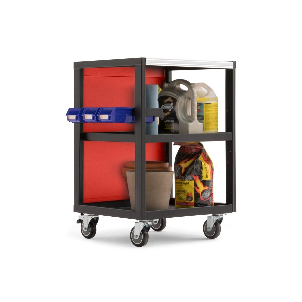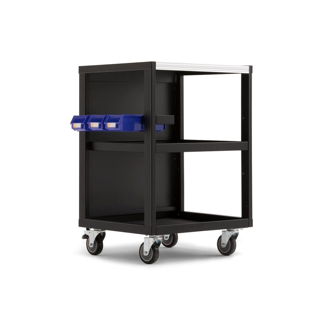 Designed for storage that goes where you need it, when you need it. The Pro Series Mobile Utility Cart gives you a portable solution for organizing tools, equipment and small parts, reducing the time spent looking for items you require close at hand. Heavy-duty steel shelves include premium rubber liners that protect your tools and prevent rolling and sliding when on the move. The interior full-width shelf can be installed at different heights to accommodate all sizes of items, and the removable half-width tool tray with adjustable dividers is perfect for holding electronics, keys, hand tools, or other small equipment. Included with the Utility Cart are four small parts bins for holding screws, washers and hardware, which can be clipped onto shelf edges for easy access. Smoothly roll the Utility Cart around your workspace on four swiveling caster wheels with front wheel locks to secure it in place, and after the job is done, the Cart can be stored beneath worktops or integrated into cabinet sets, with easy-grab handles on both sides. The Mobile Utility Cart ships flat packed and is easy to assemble with all necessary hardware included. For a more efficient, functional workspace, the Pro Series Mobile Utility Cart is the perfect portable storage solution.