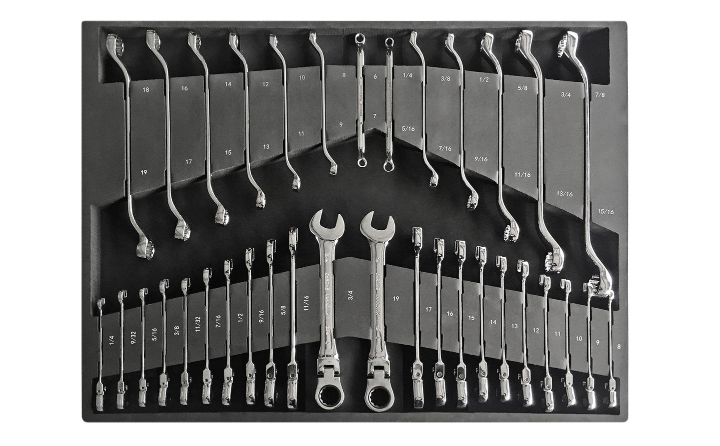 Custom fit for you Pro 3.0 and Performance Plus 2.0 Series Tool Cabinets, the Wrench Tray provides you with the tools you need for your next project. Crafted from chromium-vanadium steel for durability and corrosion resistance, these wrenches are also placed in a labelled custom-cut, EVA tray so you'll never loose them.